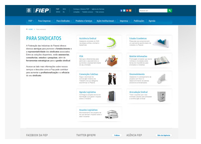 Com base nos interesses dos diferentes públicos que buscam informação no site do Sistema Fiep, seu conteúdo foi segmentado. Para tanto, a arquitetura de informação foi planejada com foco nos sindicatos, empresas e comunidade, aprimorando a navegabilidade.